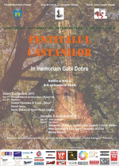Festivalul Castanilor este singurul festival de muzică cu vechime și recunoaștere care se desfășoară în Ploiești. Asta ca să știe toată lumea încă din start despre ce vorbim. Anul acesta are loc cea de a 13-a ediție în perioada 5-6 octombrie. Festivalul, care în ultimii ani poartă numele unuia dintre inițiatori, jurnalistul Gabi Dobre este conceput ca un eveniment care are scopul readuceri în atenția publicului amator a unui gen muzical neîndreptățit în ultimul timp, folkul.