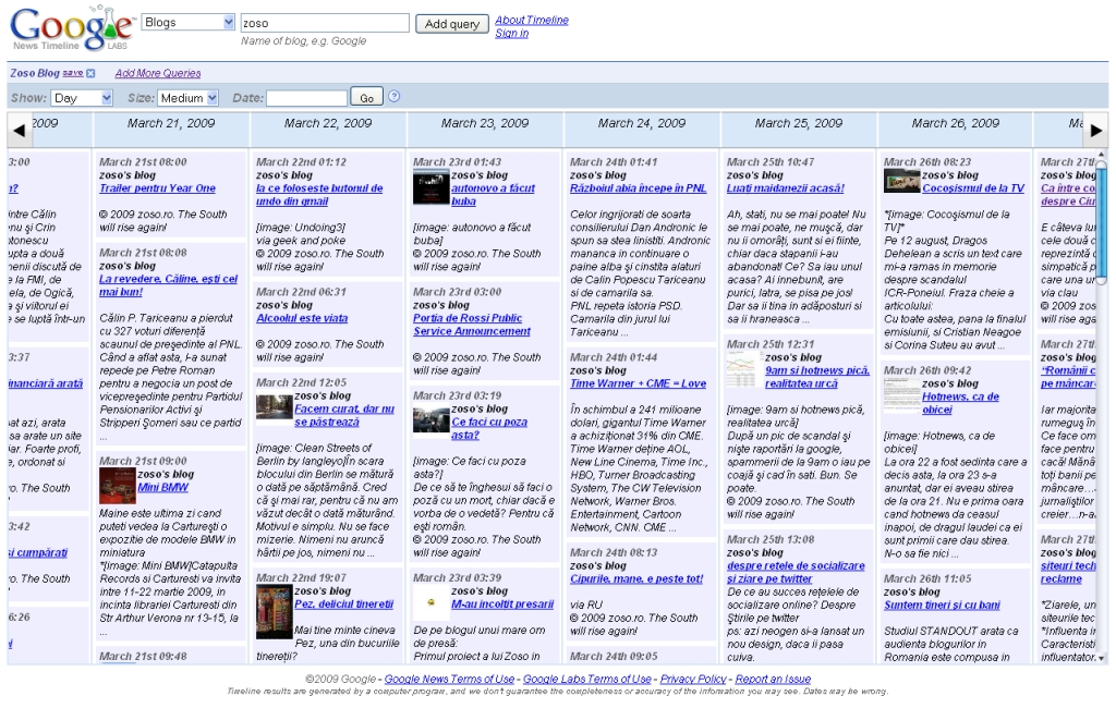 Pe de o parte se dă noua aplicaţie de la Google, News Timeline. Se alege din listă Blogs şi se începe căutarea: Cabral, Arhi, Visurât, Fulgerică, Manafu, eCostin, Bobby Voicu, Alex Brie, Mircea Badea, Ciutacu, Elena Udrea, Ahilosu sau chiar Waven. Google, enervant de consecvent şi incompetent cât cuprinde o ţine una şi bună, nu şi nu No blogs are available for “……….”.