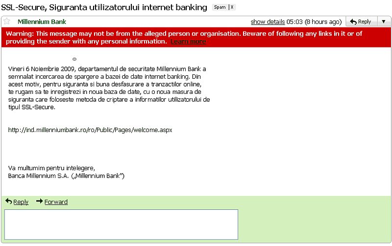 Tot de astăzi, o nouă bancă intră în selectul club al phishing-ului bancar made in romania: Millenium Bank. Să le fie de bine!