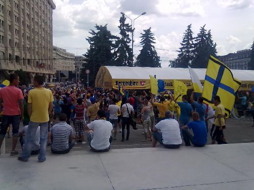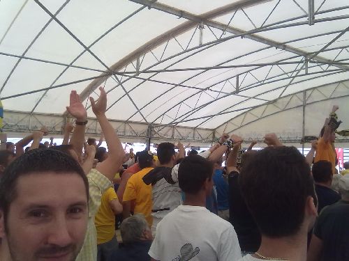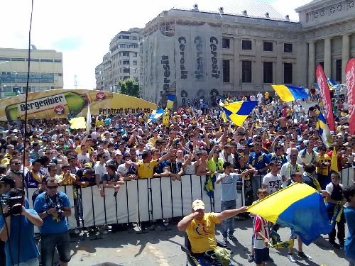 Am suspinat cu ei, am oftat și am tremurat împreună până la cel de-al doilea gol al petroliștilor. Moment în care isteria a devenit generală și întreaga terasă a răbufnit. Am plecat să fac ultimele pregătiri pentru petrecerea sărbătoritei dar m-am întors la terasa galbenă exact când primii suporteri se întorceau de la stadion și începeau fiesta. În așteptarea echipei și a antrenorului am asistat la una dintre cele mai frumoase sărbători a unei galerii. Totul în jur era galben albastru, de la steaguri la tricouri, la coafuri sau măști. Zeci de video camere înregistrau, sute de aparate foto imortalizau, mii de suporteri petreceau.