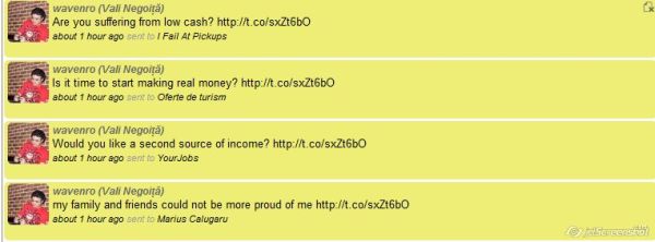 În seara asta, am reactivat aplicația, fiind prin oraș cu treabă și dornic de vorbă. După 2 ore am primit avertismente că spam-urile au pornit din nou. Nu știu cât a durat și câți dintre urmăritorii mei au fost deranjați, dar după intensitatea feedback-ului, se pare că destul de mulți. Oricum aplicația mea de twitter îmi arătă în lista de DM-uri trimise o listă luuungă de așa ceva:
