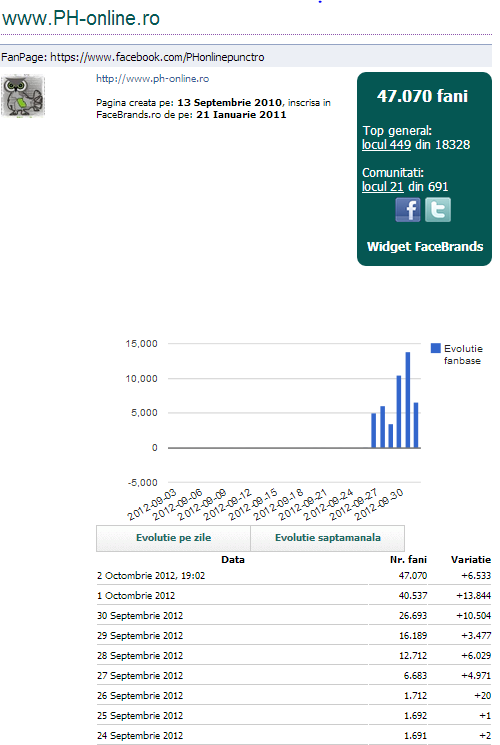 Și deși introducerea a fost (poate) cam lungă ajungem și la subiectul, oarecum previzibil din titlu, al acestui articol. Și anume, recenta campanie de achiziții de like-uri pe Facebook a site-ului PHonline.ro. Între 21 mai 2010 și 26 septembrie 2012, timp de 603 zile pagina de Facebook arondată site-ului, PHonlinepunctro (neinspirat nume, nu?) a crescut liniștit într-un ritm de aproape 3 like-uri pe zi, ajungând miercurea trecută la un număr de 1712 like-uri. Mult prea puțin pentru grandomanul Fido, motiv pentru care acesta a plecat la piață. De unde s-a întors cu sacoșile pline motiv pentru care, într-o săptămână, pagina (care oferă o interacțiune nulă cu cititorii săi) a crescut cu 2750% ajungând la 47.070 like-uri (asta la ora la care am scris eu articolul). Și încă mai crește ca Făt-Frumos din poveștile pentru copii mici.